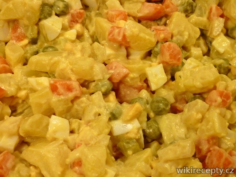 Brambory ve slupce a kořenovou zeleninu uvaříme v silném vývaru nebo ve vodě doměkka. Vajíčka uvaříme natvrdo; trvá to asi 5 minuty. Zeleninu slijeme, necháme vychladnout a nakrájíme na menší kostičky a přesuneme do velké mísy. Přihodíme okurky, hrášek a šalotku. Na závěr přidáme na kostičky pokrájená vajíčka. Základ salátu ochutíme majonézou, hořčicí, solí, pepřem a lákem z okurek. Salát mícháme, až když máme všechny suroviny v jedné míse, a mícháme lehce, odspodu nahoru. Po zamíchání a případném dochucení necháme salát v chladu aspoň hodinu odležet. Nejlepší je salát druhý a třetí den.