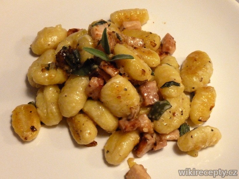 Gnocchi uvaříme ve vroucí osolené vodě a pořádně scedíme. Na rozpálené pánvi opečeme na másle na kostičky nakrájený špek/pancettu. Přihodíme pokrájenou šalvěj, promícháme a necháme provonět. Do pánve přihodíme gnocchi a opékáme dozlatova. Osolíme, opepříme, zmírníme teplotu na minimum a postupně přiléváme smetanu a mícháme. Posypeme trochou parmazánu, promícháme a podáváme ozdobené čerstvou šalvějí a sypaným parmazánem.