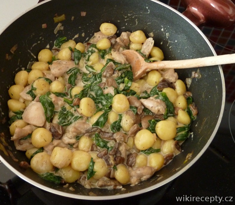 Kuřecí řízky okořeníme, zlehka vetřeme olej a na rozpálené pánvi osmahneme dozlatova. Opečené maso přendáme do hlubokého talíře nebo misky, přikryjeme alobalem a necháme ležet v teple. Na středním plameni rozpustíme v pánvi máslo, osmahneme na něm pokrájenou cibuli, přihodíme česnek a houby, zvýšíme teplotu, přilijeme víno a čekáme, než se alkohol odpaří. Poté přilijeme vývar a přibližně 10 minut za stálého míchání dusíme. Mezitím uvaříme noky dle návodu a scezené je společně s kuřecím masem, nakrájeným na menší kousky, přihodíme do pánve k houbám a chvíli prudce opékáme. Stáhneme plamen, přidáme špenát, který předtím spaříme horkou vodou, promícháme, přilijeme smetanu a 10 minut opékáme. Dochutíme a buď podáváme nebo posypané parmazánem můžeme dát ještě na chvíli zapéct pod rozpálený gril.
