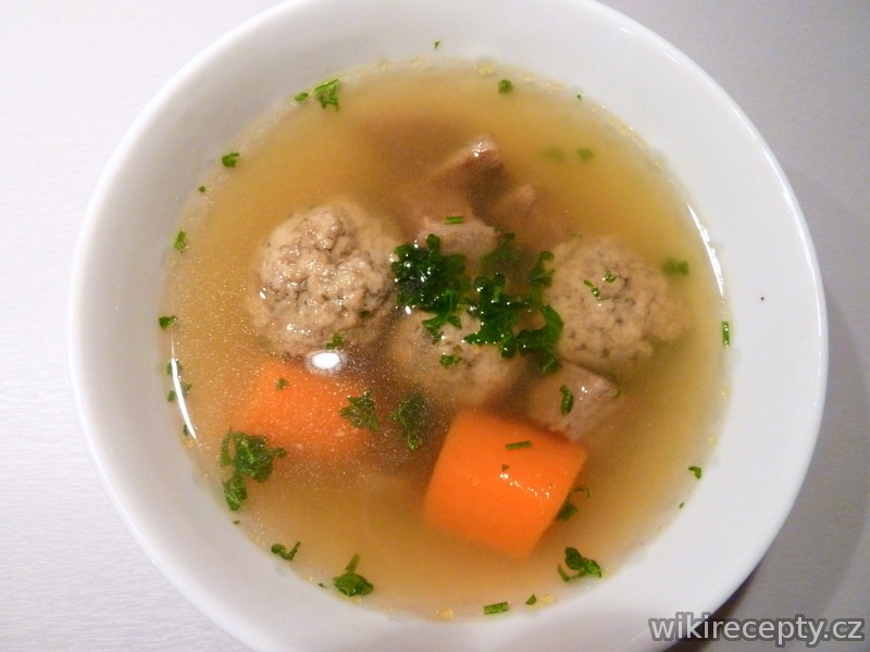 Maso vložíme do hrnce s 2,5l vody a pomalu přivedeme k varu. Přidáme koření, očistěnou a na větší kusy pokrájenou zeleninu a svázanou nať. Všechno necháme aspoň 3 hodiny vařit mírným varem. Pokud musíme dolévat vodu, pak jen vroucí. Vývar průběžně kontrolujeme a naběračkou z něj sbíráme pěnu. Zatímco se polévka vaří, připravíme si knedlíčky. Játra rozmixujeme nebo umeleme v ručním mlýnku a dáme do misky. Přimícháme česnek, opepříme, přidáme majoránku a rozklepneme vajíčko. Postupně přisypáváme strouhanku tak, abychom dostali tužší hmotu, příp. můžeme dosypat krupicí pro pevnější konzistenci. Nesolíme! Rozkrájíme na kousky a tvarujeme kuličky přibližně o průměru 2cm (na tvarování je lepší mít navhlčené ruce). Než se nám uvaří vývar, knedlíčky dáme odpočívat do chladničky.