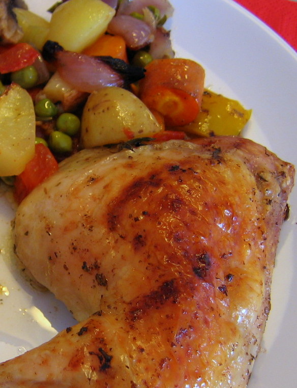 Stehna naložíme do marinády z hořčice, másla, vína, tymiánu a rozmarýnu a necháme aspoň 2 hodiny marinovat. Oloupeme a pokrájíme brambory. Maso z marinády vyndáme a v pekáčku ji smícháme s bramborami, mrkví, česnekem, citronovou šťávou, solí a 20 minut pečeme v troubě vyhřáté na 190°C. Přidáme maso a pečeme ještě 45 minut dozlatova. Podáváme sypané petrželkou nebo šnitlíkem.