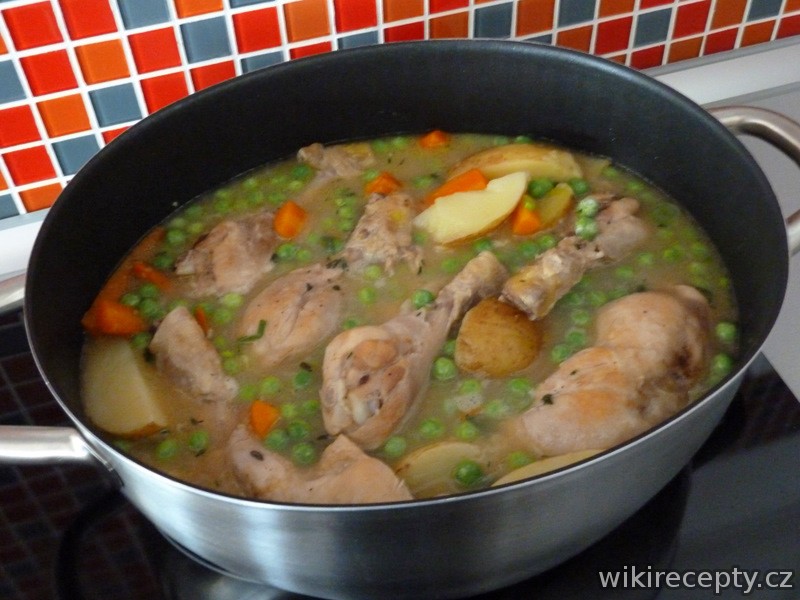 Kuřecí stehna osolíme a v hrnci nebo hluboké pánvi na oleji osmahneme dozlatova. Vmícháme bílé části z jarní cibulky, mouku a kuřecí vývar a mícháme, dokud se mouka nerozpustí. Poté zalijeme 750 ml horké vody, přidáme brambory a karotku a přivedeme k varu. Vaříme přikryté poklicí asi 20 minut. Poté odkryjeme a necháme probublávat ještě dalších 15 minut. Nakonec přidáme hrášek a prohříváme ještě asi 5 minut, okořeníme, vmícháme hořčici, nať z jarních cibulek a bylinky.