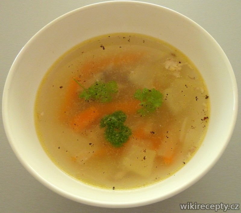 Křídla vložíme do hrnce s 1,5l vody a pomalu přivedeme k varu. Uvařená křídla obereme a vývar přecedíme. Zeleninu oškrábeme a nakrájíme na nudličky, případně ji nahrubo nastrouháme. V polévkovém hrnci rozehřejeme máslo nebo olej a krátce osmahneme zeleninu dozlatova. Zalijeme vývarem a při středním varu asi 15 minut vaříme, až bude zelenina měkká na skus, ale ne rozvařená. Ke konci přidáme kuřecí maso a podle potřeby dosolíme a opepříme. V jiném hrnci krátce povaříme nudle; stačí tak 3-5 minut. Nudle rozdělíme do talířů, zalijeme horkou polévkou a ozdobíme šnitlíkem nebo petrželkou.