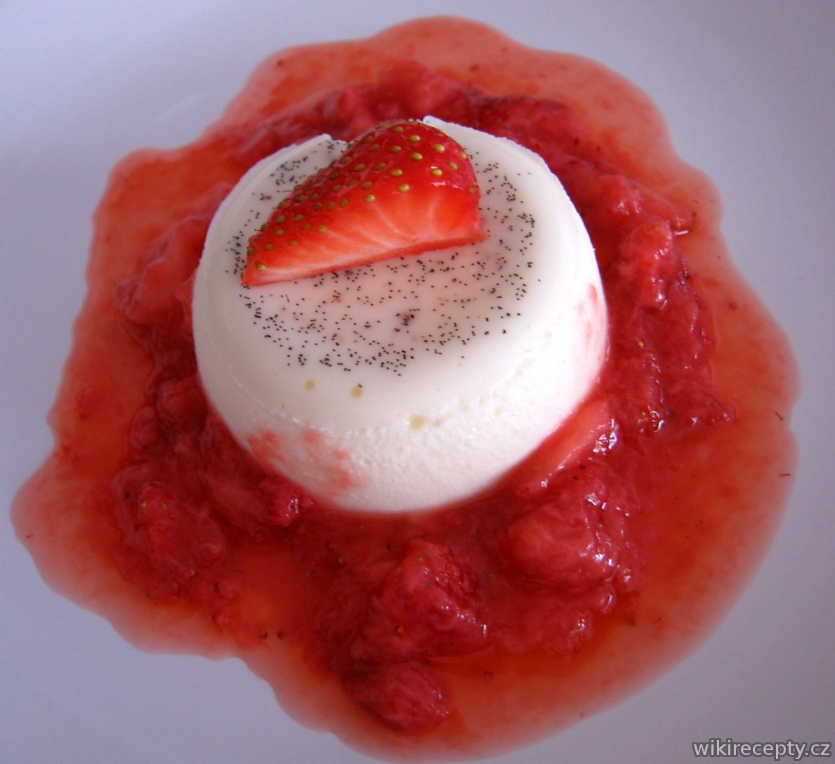 B) Plátky želatiny namočíme na pět minut do vlažné vody, pak je vyndáme a necháme okapat. Smetanu na vaření, cukr a vanilkový lusk pomalu zahříváme v hrnci. Až se cukr rozpustí, přidáme plátky želatiny a řádně mícháme do rozpuštění, pak necháme zchladnout.Vyndáme vanilkový lus,, ušleháme smetanu ke šlehání a přimícháme ji spolu s jogurtem k vanilkovému základu. 4 formičky o objemu 125 ml velmi jemně vymažeme olejem, vlijeme do nich směs a dáme přes noc chladit, aby se zpevnily. Pět minut před podáváním vyndáme z ledničky a vyklopíme. Jahody svaříme (nebo jen rozmačkáme) s cukrem, vychladíme a podávejte s panna cottou.