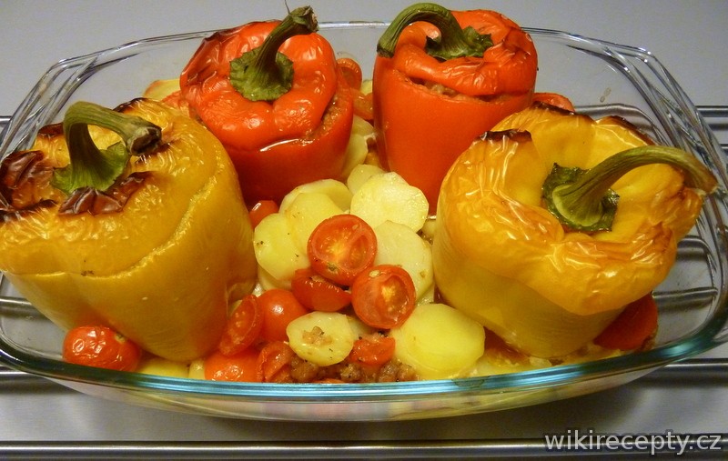 Zchladlé maso promícháme s nastrouhaným sýrem, papriky naplníme a přikryjeme vrchní částí z paprik. Papriky vložíme do olejem vymazané zapékací misy. Brambory oloupeme, nakrájíme na tenčí plátky a přidáme k paprikám, osolíme je a polijeme smetanou. Pečeme v rozehřáté troubě na 170C asi 40 minut.