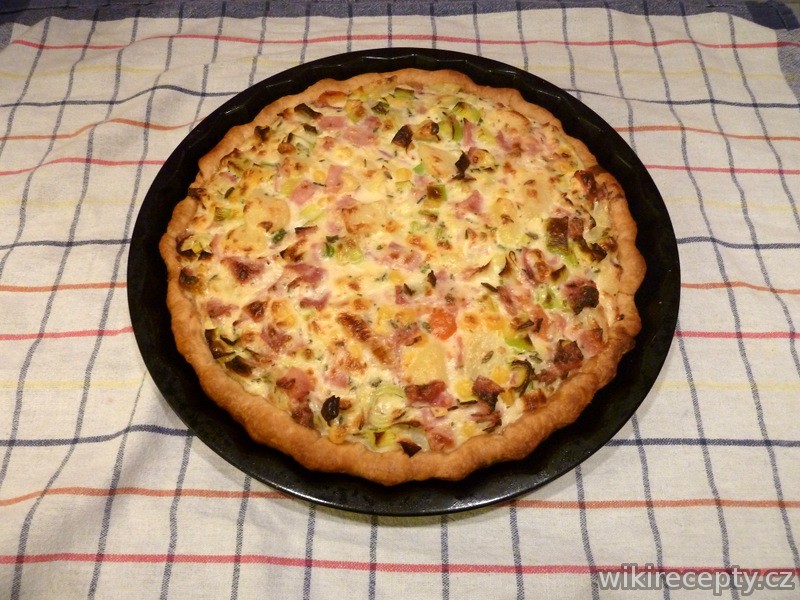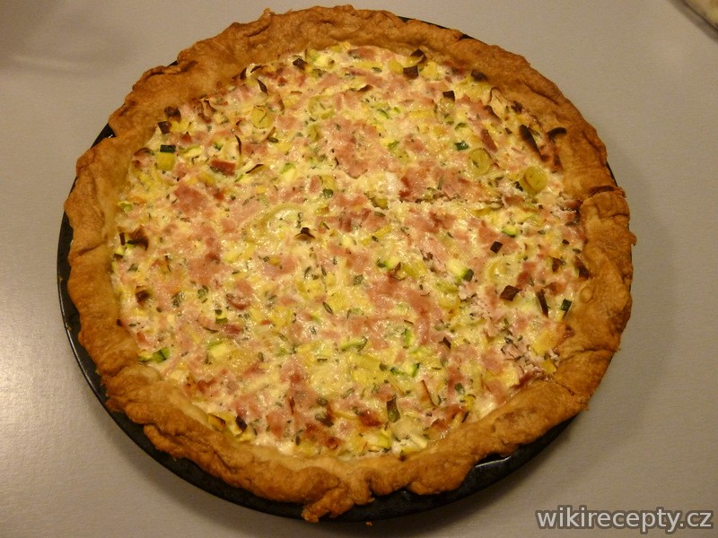 Nejdříve rozšleháme vajíčka, pak přidame smetanu, sýr, lehce osolíme, opepříme a promícháme. Smícháme šunku pokrájenou na malé kostičky, pórek a cuketu. Přidáme lučinu, bylinky a vaječno-smetanovou směs. Vše pořádně promícháme a naplníme korpus.