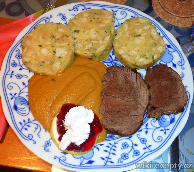 Maso podáváme nakrájené na plátky, přelité omáčkou, s brusinkami, citronem a s karlovarským knedlíkem.