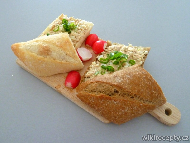 Tuňáka slijeme a promícháme s uvařenými vejci, pokrájenými na kostičky. Přidáme cottage, pokrájenou cibuli, hořčici, máslo, šťávu z citronu, olivový olej, osolíme, opepříme a vše pořádně promícháme. Pomazánku podáváme s bílým pečivem třeba s francouzkou bagetou posypeme pažitkou a ozdobíme pokrájenými rajčaty a ředkvičkami.
