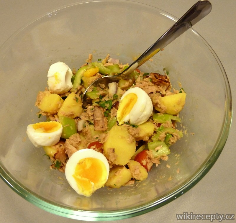 Brambory vaříme v osolené vodě doměkka, cca 20 minut. Scedíme je, ochladíme pod studenou vodou a nakrájejíme na plátky nenbo na klínky. Ihned promícháme se zálivkou a necháme vychladnout. Mezitím uvaříme vejce natvrdo (trvá to osm až deset minut) a po vychladnutí je rozkrájíme na čtvrtky. Salátové listy natrháme do velké mísy a opatrně přimícháme ostatní přísady včetně brambor a vajec. Salát před podáváním pokapeme olivovým olejem.